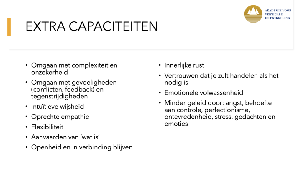 Presencing werkt aanstekelijk op je omgeving. Als het zuiver genoeg is, hebben mensen de neiging om zich ook in het Presencing-veld te begeven. Er ontstaan open gesprekken en er is meer vertrouwen. En jij ‘draagt’ dit, omdat je het vertrouwen hebt in wat er gebeurt en de capaciteit hebt ‘ertussenuit te blijven’. Omdat jij in staat bent Presencing te brengen en te behouden, ook in lastige en uitdagende omstandigheden. Zonder angst, zonder gedoe, moeiteloos. Je krijgt steeds meer toegang tot extra capaciteiten.